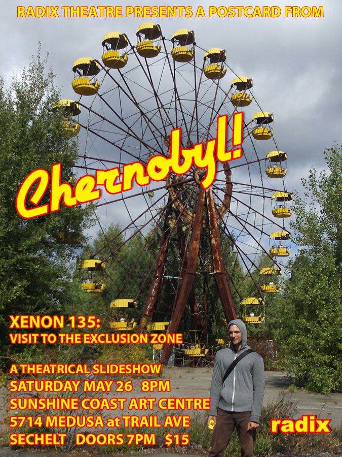 This Saturday, May 26 in Sechelt, Radix presents Xenon 135, a theatrical slideshow created by Billy Marchenski and Alison Denham. Xenon 135 is one of the recurring micro-events leading up to our major production Slowpoke, inspired by the 1986 Chernobyl nuclear incident. Billy and Alison will present material generated from their research trip to the Chernobyl Exclusion Zone last year.